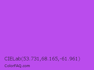 CIELab 53.731,68.165,-61.961 Color is a light purple color and the nearest color is Medium Orchid #ba55d3. Hex code #ba4ced and RGB value is rgb(186,76,237). In RGB color space, this color is composed of 73% red, 30% green, 93% blue, In CMYK color space, this color is composed of 22% cyan, 68% magenta, 0% yellow , 7% black , In HSL color space, this color has a hue angle of 281° , 82% saturation and 61% lightness.