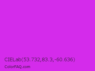 CIELab 53.732,83.3,-60.636 Color is a normal magenta color and the nearest color is Steel Pink #cc33cc. Hex code #d42beb and RGB value is rgb(212,43,235). In RGB color space, this color is composed of 83% red, 17% green, 92% blue, In CMYK color space, this color is composed of 10% cyan, 82% magenta, 0% yellow , 8% black , In HSL color space, this color has a hue angle of 293° , 83% saturation and 55% lightness.