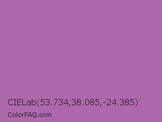 CIELab 53.734,38.085,-24.385 Color is a normal magenta color and the nearest color is Pearly Purple #b768a2. Hex code #ad68ab and RGB value is rgb(173,104,171). In RGB color space, this color is composed of 68% red, 41% green, 67% blue, In CMYK color space, this color is composed of 0% cyan, 40% magenta, 1% yellow , 32% black , In HSL color space, this color has a hue angle of 302° , 30% saturation and 54% lightness.