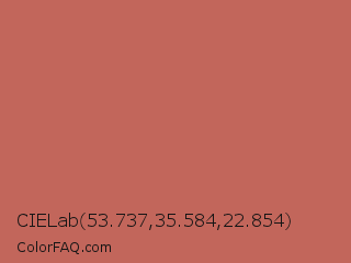 CIELab 53.737,35.584,22.854 Color is a normal red color and the nearest color is Fuzzy Wuzzy #cc6666. Hex code #c2665b and RGB value is rgb(194,102,91). In RGB color space, this color is composed of 76% red, 40% green, 36% blue, In CMYK color space, this color is composed of 0% cyan, 47% magenta, 53% yellow , 24% black , In HSL color space, this color has a hue angle of 6° , 46% saturation and 56% lightness.