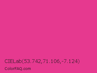 CIELab 53.742,71.106,-7.124 Color is a normal rose color and the nearest color is Cerise Pink #ec3b83. Hex code #e6398f and RGB value is rgb(230,57,143). In RGB color space, this color is composed of 90% red, 22% green, 56% blue, In CMYK color space, this color is composed of 0% cyan, 75% magenta, 38% yellow , 10% black , In HSL color space, this color has a hue angle of 330° , 78% saturation and 56% lightness.
