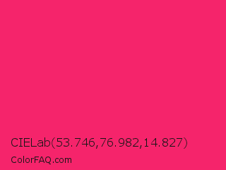 CIELab 53.746,76.982,14.827 Color is a normal rose color and the nearest color is Razzmatazz #e3256b. Hex code #f5246b and RGB value is rgb(245,36,107). In RGB color space, this color is composed of 96% red, 14% green, 42% blue, In CMYK color space, this color is composed of 0% cyan, 85% magenta, 56% yellow , 4% black , In HSL color space, this color has a hue angle of 340° , 91% saturation and 55% lightness.