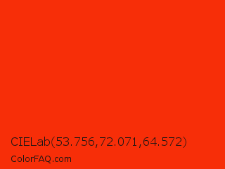 CIELab 53.756,72.071,64.572 Color is a normal red color and the nearest color is Ferrari Red #ff2800. Hex code #f72e08 and RGB value is rgb(247,46,8). In RGB color space, this color is composed of 97% red, 18% green, 3% blue, In CMYK color space, this color is composed of 0% cyan, 81% magenta, 97% yellow , 3% black , In HSL color space, this color has a hue angle of 10° , 94% saturation and 50% lightness.