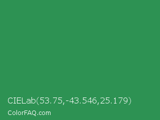 CIELab 53.75,-43.546,25.179 Color is a normal green color and the nearest color is Sea Green #2e8b57. Hex code #2d9253 and RGB value is rgb(45,146,83). In RGB color space, this color is composed of 18% red, 57% green, 33% blue, In CMYK color space, this color is composed of 69% cyan, 0% magenta, 43% yellow , 43% black , In HSL color space, this color has a hue angle of 143° , 53% saturation and 37% lightness.