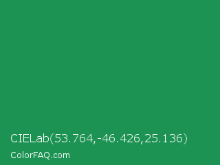 CIELab 53.764,-46.426,25.136 Color is a normal green color and the nearest color is Eucalyptus #278a5b. Hex code #1d9353 and RGB value is rgb(29,147,83). In RGB color space, this color is composed of 11% red, 58% green, 33% blue, In CMYK color space, this color is composed of 80% cyan, 0% magenta, 44% yellow , 42% black , In HSL color space, this color has a hue angle of 147° , 67% saturation and 35% lightness.