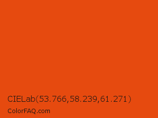CIELab 53.766,58.239,61.271 Color is a normal orange color and the nearest color is Trinidad #e64e03. Hex code #e64a0f and RGB value is rgb(230,74,15). In RGB color space, this color is composed of 90% red, 29% green, 6% blue, In CMYK color space, this color is composed of 0% cyan, 68% magenta, 93% yellow , 10% black , In HSL color space, this color has a hue angle of 16° , 88% saturation and 48% lightness.