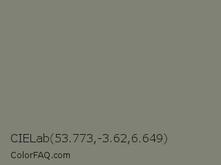 CIELab 53.773,-3.62,6.649 Color is a normal lime color and the nearest color is Friar Gray #807e79. Hex code #7f8275 and RGB value is rgb(127,130,117). In RGB color space, this color is composed of 50% red, 51% green, 46% blue, In CMYK color space, this color is composed of 2% cyan, 0% magenta, 10% yellow , 49% black , In HSL color space, this color has a hue angle of 74° , 5% saturation and 48% lightness.