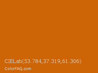 CIELab 53.784,37.319,61.306 Color is a normal orange color and the nearest color is Red Stage #d05f04. Hex code #cc6305 and RGB value is rgb(204,99,5). In RGB color space, this color is composed of 80% red, 39% green, 2% blue, In CMYK color space, this color is composed of 0% cyan, 51% magenta, 98% yellow , 20% black , In HSL color space, this color has a hue angle of 28° , 95% saturation and 41% lightness.