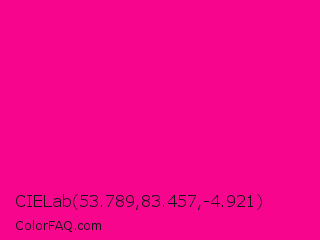 CIELab 53.789,83.457,-4.921 Color is a normal magenta color and the nearest color is Magenta Process #ff0090. Hex code #f7058c and RGB value is rgb(247,5,140). In RGB color space, this color is composed of 97% red, 2% green, 55% blue, In CMYK color space, this color is composed of 0% cyan, 98% magenta, 43% yellow , 3% black , In HSL color space, this color has a hue angle of 327° , 96% saturation and 49% lightness.