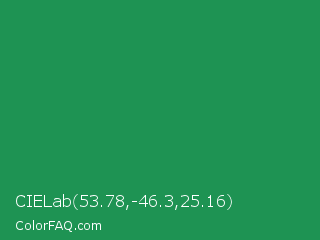 CIELab 53.78,-46.3,25.16 Color is a normal green color and the nearest color is Eucalyptus #278a5b. Hex code #1e9353 and RGB value is rgb(30,147,83). In RGB color space, this color is composed of 12% red, 58% green, 33% blue, In CMYK color space, this color is composed of 80% cyan, 0% magenta, 44% yellow , 42% black , In HSL color space, this color has a hue angle of 147° , 66% saturation and 35% lightness.