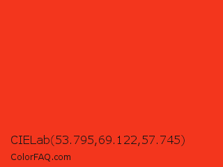 CIELab 53.795,69.122,57.745 Color is a normal red color and the nearest color is Pomegranate #f34723. Hex code #f3361d and RGB value is rgb(243,54,29). In RGB color space, this color is composed of 95% red, 21% green, 11% blue, In CMYK color space, this color is composed of 0% cyan, 78% magenta, 88% yellow , 5% black , In HSL color space, this color has a hue angle of 7° , 90% saturation and 53% lightness.