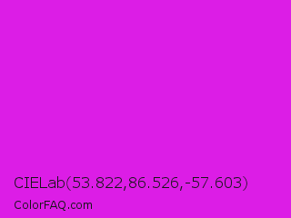 CIELab 53.822,86.526,-57.603 Color is a normal magenta color and the nearest color is Steel Pink #cc33cc. Hex code #dc1de6 and RGB value is rgb(220,29,230). In RGB color space, this color is composed of 86% red, 11% green, 90% blue, In CMYK color space, this color is composed of 4% cyan, 87% magenta, 0% yellow , 10% black , In HSL color space, this color has a hue angle of 297° , 80% saturation and 51% lightness.