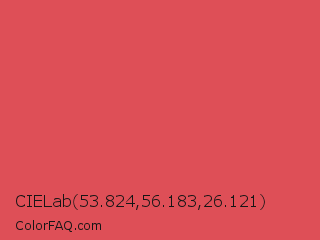 CIELab 53.824,56.183,26.121 Color is a normal red color and the nearest color is Mandy #e25465. Hex code #de4f57 and RGB value is rgb(222,79,87). In RGB color space, this color is composed of 87% red, 31% green, 34% blue, In CMYK color space, this color is composed of 0% cyan, 64% magenta, 61% yellow , 13% black , In HSL color space, this color has a hue angle of 357° , 68% saturation and 59% lightness.