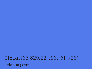CIELab 53.829,22.195,-61.726 Color is a light blue color and the nearest color is Blueberry #4f86f7. Hex code #537aec and RGB value is rgb(83,122,236). In RGB color space, this color is composed of 33% red, 48% green, 93% blue, In CMYK color space, this color is composed of 65% cyan, 48% magenta, 0% yellow , 7% black , In HSL color space, this color has a hue angle of 225° , 80% saturation and 63% lightness.