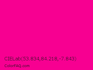 CIELab 53.834,84.218,-7.843 Color is a normal magenta color and the nearest color is Magenta Process #ff0090. Hex code #f70091 and RGB value is rgb(247,0,145). In RGB color space, this color is composed of 97% red, 0% green, 57% blue, In CMYK color space, this color is composed of 0% cyan, 100% magenta, 41% yellow , 3% black , In HSL color space, this color has a hue angle of 325° , 100% saturation and 48% lightness.