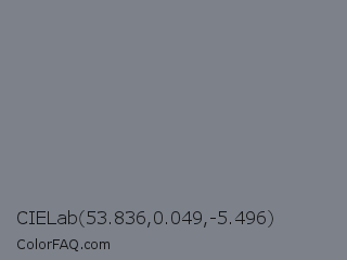 CIELab 53.836,0.049,-5.496 Color is a normal blue color and the nearest color is Gunsmoke #828685. Hex code #7c818a and RGB value is rgb(124,129,138). In RGB color space, this color is composed of 49% red, 51% green, 54% blue, In CMYK color space, this color is composed of 10% cyan, 7% magenta, 0% yellow , 46% black , In HSL color space, this color has a hue angle of 219° , 6% saturation and 51% lightness.