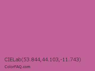 CIELab 53.844,44.103,-11.743 Color is a normal magenta color and the nearest color is Pearly Purple #b768a2. Hex code #bf6196 and RGB value is rgb(191,97,150). In RGB color space, this color is composed of 75% red, 38% green, 59% blue, In CMYK color space, this color is composed of 0% cyan, 49% magenta, 21% yellow , 25% black , In HSL color space, this color has a hue angle of 326° , 42% saturation and 56% lightness.