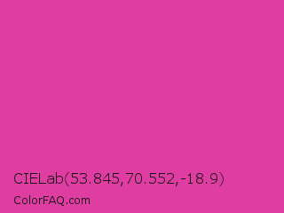 CIELab 53.845,70.552,-18.9 Color is a normal magenta color and the nearest color is Frostbite #e936a7. Hex code #e03da3 and RGB value is rgb(224,61,163). In RGB color space, this color is composed of 88% red, 24% green, 64% blue, In CMYK color space, this color is composed of 0% cyan, 73% magenta, 27% yellow , 12% black , In HSL color space, this color has a hue angle of 322° , 72% saturation and 56% lightness.