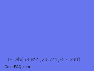 CIELab 53.855,29.741,-63.299 Color is a light blue color and the nearest color is Very Light Blue #6666ff. Hex code #6775ef and RGB value is rgb(103,117,239). In RGB color space, this color is composed of 40% red, 46% green, 94% blue, In CMYK color space, this color is composed of 57% cyan, 51% magenta, 0% yellow , 6% black , In HSL color space, this color has a hue angle of 234° , 81% saturation and 67% lightness.