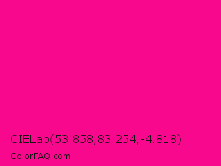 CIELab 53.858,83.254,-4.818 Color is a normal magenta color and the nearest color is Magenta Process #ff0090. Hex code #f7088c and RGB value is rgb(247,8,140). In RGB color space, this color is composed of 97% red, 3% green, 55% blue, In CMYK color space, this color is composed of 0% cyan, 97% magenta, 43% yellow , 3% black , In HSL color space, this color has a hue angle of 327° , 94% saturation and 50% lightness.