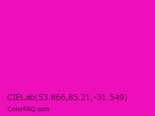 CIELab 53.866,85.21,-31.549 Color is a normal magenta color and the nearest color is Shocking Pink #fc0fc0. Hex code #ed0fb9 and RGB value is rgb(237,15,185). In RGB color space, this color is composed of 93% red, 6% green, 73% blue, In CMYK color space, this color is composed of 0% cyan, 94% magenta, 22% yellow , 7% black , In HSL color space, this color has a hue angle of 314° , 88% saturation and 49% lightness.
