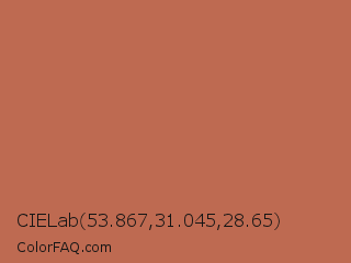 CIELab 53.867,31.045,28.65 Color is a normal red color and the nearest color is Copper Red #cb6d51. Hex code #be6a51 and RGB value is rgb(190,106,81). In RGB color space, this color is composed of 75% red, 42% green, 32% blue, In CMYK color space, this color is composed of 0% cyan, 44% magenta, 57% yellow , 25% black , In HSL color space, this color has a hue angle of 14° , 46% saturation and 53% lightness.