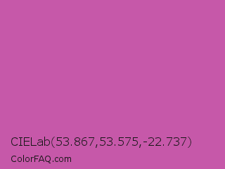 CIELab 53.867,53.575,-22.737 Color is a normal magenta color and the nearest color is Super Pink #cf6ba9. Hex code #c658a9 and RGB value is rgb(198,88,169). In RGB color space, this color is composed of 78% red, 35% green, 66% blue, In CMYK color space, this color is composed of 0% cyan, 56% magenta, 15% yellow , 22% black , In HSL color space, this color has a hue angle of 316° , 49% saturation and 56% lightness.