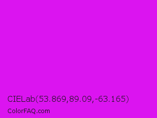 CIELab 53.869,89.09,-63.165 Color is a normal magenta color and the nearest color is Phlox #df00ff. Hex code #db14f0 and RGB value is rgb(219,20,240). In RGB color space, this color is composed of 86% red, 8% green, 94% blue, In CMYK color space, this color is composed of 9% cyan, 92% magenta, 0% yellow , 6% black , In HSL color space, this color has a hue angle of 294° , 88% saturation and 51% lightness.