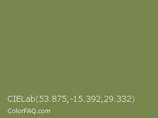 CIELab 53.875,-15.392,29.332 Color is a normal lime color and the nearest color is Gold Fusion #85754e. Hex code #78874d and RGB value is rgb(120,135,77). In RGB color space, this color is composed of 47% red, 53% green, 30% blue, In CMYK color space, this color is composed of 11% cyan, 0% magenta, 43% yellow , 47% black , In HSL color space, this color has a hue angle of 76° , 27% saturation and 42% lightness.