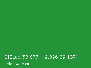 CIELab 53.877,-49.896,39.137 Color is a normal green color and the nearest color is Forest Green #228b22. Hex code #259438 and RGB value is rgb(37,148,56). In RGB color space, this color is composed of 15% red, 58% green, 22% blue, In CMYK color space, this color is composed of 75% cyan, 0% magenta, 62% yellow , 42% black , In HSL color space, this color has a hue angle of 130° , 60% saturation and 36% lightness.