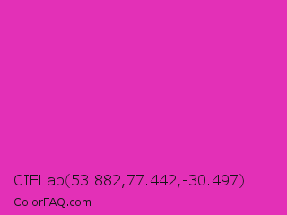 CIELab 53.882,77.442,-30.497 Color is a normal magenta color and the nearest color is Frostbite #e936a7. Hex code #e330b7 and RGB value is rgb(227,48,183). In RGB color space, this color is composed of 89% red, 19% green, 72% blue, In CMYK color space, this color is composed of 0% cyan, 79% magenta, 19% yellow , 11% black , In HSL color space, this color has a hue angle of 315° , 76% saturation and 54% lightness.