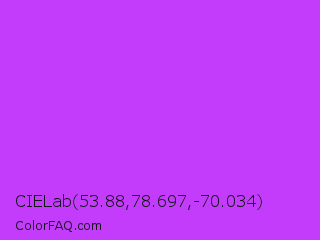 CIELab 53.88,78.697,-70.034 Color is a light purple color and the nearest color is Veronica #a020f0. Hex code #c33cfc and RGB value is rgb(195,60,252). In RGB color space, this color is composed of 76% red, 24% green, 99% blue, In CMYK color space, this color is composed of 23% cyan, 76% magenta, 0% yellow , 1% black , In HSL color space, this color has a hue angle of 282° , 97% saturation and 61% lightness.