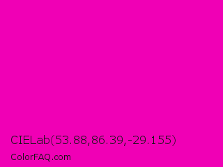 CIELab 53.88,86.39,-29.155 Color is a normal magenta color and the nearest color is Hollywood Cerise #f400a1. Hex code #f000b5 and RGB value is rgb(240,0,181). In RGB color space, this color is composed of 94% red, 0% green, 71% blue, In CMYK color space, this color is composed of 0% cyan, 100% magenta, 25% yellow , 6% black , In HSL color space, this color has a hue angle of 315° , 100% saturation and 47% lightness.