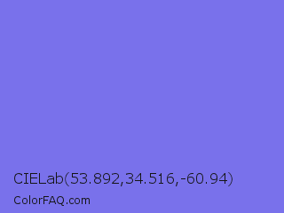 CIELab 53.892,34.516,-60.94 Color is a light indigo color and the nearest color is Medium Slate Blue #7b68ee. Hex code #7971eb and RGB value is rgb(121,113,235). In RGB color space, this color is composed of 47% red, 44% green, 92% blue, In CMYK color space, this color is composed of 49% cyan, 52% magenta, 0% yellow , 8% black , In HSL color space, this color has a hue angle of 244° , 75% saturation and 68% lightness.