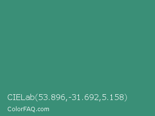 CIELab 53.896,-31.692,5.158 Color is a normal green color and the nearest color is Illuminating Emerald #319177. Hex code #3a8f77 and RGB value is rgb(58,143,119). In RGB color space, this color is composed of 23% red, 56% green, 47% blue, In CMYK color space, this color is composed of 59% cyan, 0% magenta, 17% yellow , 44% black , In HSL color space, this color has a hue angle of 163° , 42% saturation and 39% lightness.
