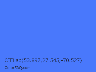 CIELab 53.897,27.545,-70.527 Color is a light blue color and the nearest color is Blueberry #4f86f7. Hex code #4978fc and RGB value is rgb(73,120,252). In RGB color space, this color is composed of 29% red, 47% green, 99% blue, In CMYK color space, this color is composed of 71% cyan, 52% magenta, 0% yellow , 1% black , In HSL color space, this color has a hue angle of 224° , 97% saturation and 64% lightness.