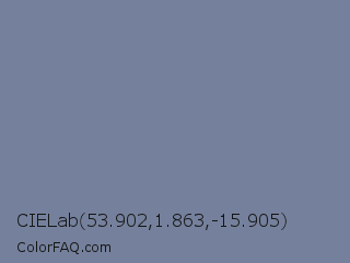 CIELab 53.902,1.863,-15.905 Color is a normal blue color and the nearest color is Light Slate Gray #778899. Hex code #75819c and RGB value is rgb(117,129,156). In RGB color space, this color is composed of 46% red, 51% green, 61% blue, In CMYK color space, this color is composed of 25% cyan, 17% magenta, 0% yellow , 39% black , In HSL color space, this color has a hue angle of 222° , 16% saturation and 54% lightness.