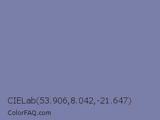 CIELab 53.906,8.042,-21.647 Color is a normal blue color and the nearest color is Shadow Blue #778ba5. Hex code #7b7ea6 and RGB value is rgb(123,126,166). In RGB color space, this color is composed of 48% red, 49% green, 65% blue, In CMYK color space, this color is composed of 26% cyan, 24% magenta, 0% yellow , 35% black , In HSL color space, this color has a hue angle of 236° , 19% saturation and 57% lightness.