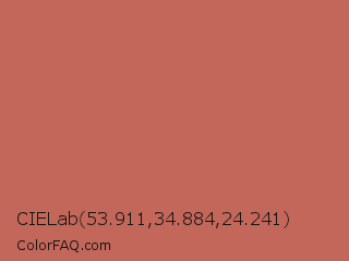 CIELab 53.911,34.884,24.241 Color is a normal red color and the nearest color is Copper Red #cb6d51. Hex code #c26759 and RGB value is rgb(194,103,89). In RGB color space, this color is composed of 76% red, 40% green, 35% blue, In CMYK color space, this color is composed of 0% cyan, 47% magenta, 54% yellow , 24% black , In HSL color space, this color has a hue angle of 8° , 46% saturation and 55% lightness.