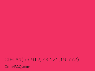 CIELab 53.912,73.121,19.772 Color is a normal rose color and the nearest color is Radical Red #ff355e. Hex code #f23063 and RGB value is rgb(242,48,99). In RGB color space, this color is composed of 95% red, 19% green, 39% blue, In CMYK color space, this color is composed of 0% cyan, 80% magenta, 59% yellow , 5% black , In HSL color space, this color has a hue angle of 344° , 88% saturation and 57% lightness.