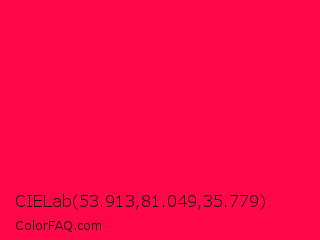 CIELab 53.913,81.049,35.779 Color is a normal rose color and the nearest color is Folly #ff004f. Hex code #ff0749 and RGB value is rgb(255,7,73). In RGB color space, this color is composed of 100% red, 3% green, 29% blue, In CMYK color space, this color is composed of 0% cyan, 97% magenta, 71% yellow , 0% black , In HSL color space, this color has a hue angle of 344° , 100% saturation and 51% lightness.