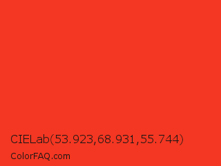 CIELab 53.923,68.931,55.744 Color is a normal red color and the nearest color is Pomegranate #f34723. Hex code #f33722 and RGB value is rgb(243,55,34). In RGB color space, this color is composed of 95% red, 22% green, 13% blue, In CMYK color space, this color is composed of 0% cyan, 77% magenta, 86% yellow , 5% black , In HSL color space, this color has a hue angle of 6° , 90% saturation and 54% lightness.