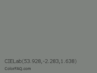 CIELab 53.928,-2.283,1.638 Color is a normal green color and the nearest color is Gray #808080. Hex code #7e827e and RGB value is rgb(126,130,126). In RGB color space, this color is composed of 49% red, 51% green, 49% blue, In CMYK color space, this color is composed of 3% cyan, 0% magenta, 3% yellow , 49% black , In HSL color space, this color has a hue angle of 120° , 2% saturation and 50% lightness.