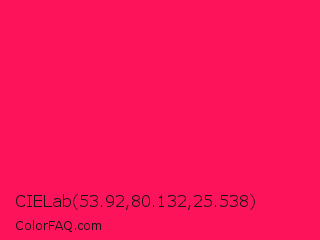 CIELab 53.92,80.132,25.538 Color is a normal rose color and the nearest color is Awesome #ff2052. Hex code #fc135a and RGB value is rgb(252,19,90). In RGB color space, this color is composed of 99% red, 7% green, 35% blue, In CMYK color space, this color is composed of 0% cyan, 92% magenta, 64% yellow , 1% black , In HSL color space, this color has a hue angle of 342° , 97% saturation and 53% lightness.