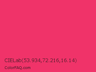 CIELab 53.934,72.216,16.14 Color is a normal rose color and the nearest color is Paradise Pink #e63e62. Hex code #f03369 and RGB value is rgb(240,51,105). In RGB color space, this color is composed of 94% red, 20% green, 41% blue, In CMYK color space, this color is composed of 0% cyan, 79% magenta, 56% yellow , 6% black , In HSL color space, this color has a hue angle of 343° , 86% saturation and 57% lightness.