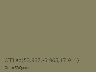 CIELab 53.937,-3.965,17.911 Color is a normal yellow color and the nearest color is Clay Creek #8a8360. Hex code #868262 and RGB value is rgb(134,130,98). In RGB color space, this color is composed of 53% red, 51% green, 38% blue, In CMYK color space, this color is composed of 0% cyan, 3% magenta, 27% yellow , 47% black , In HSL color space, this color has a hue angle of 53° , 16% saturation and 45% lightness.