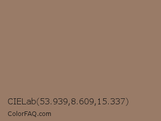 CIELab 53.939,8.609,15.337 Color is a normal orange color and the nearest color is Beaver #9f8170. Hex code #997b67 and RGB value is rgb(153,123,103). In RGB color space, this color is composed of 60% red, 48% green, 40% blue, In CMYK color space, this color is composed of 0% cyan, 20% magenta, 33% yellow , 40% black , In HSL color space, this color has a hue angle of 24° , 20% saturation and 50% lightness.