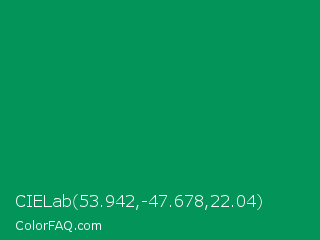 CIELab 53.942,-47.678,22.04 Color is a dark green color and the nearest color is Spanish Green #009150. Hex code #039459 and RGB value is rgb(3,148,89). In RGB color space, this color is composed of 1% red, 58% green, 35% blue, In CMYK color space, this color is composed of 98% cyan, 0% magenta, 40% yellow , 42% black , In HSL color space, this color has a hue angle of 156° , 96% saturation and 30% lightness.