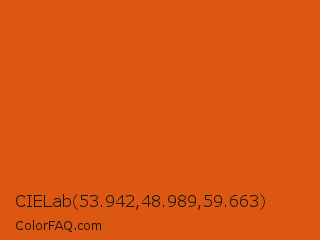 CIELab 53.942,48.989,59.663 Color is a normal orange color and the nearest color is Flame #e25822. Hex code #db5712 and RGB value is rgb(219,87,18). In RGB color space, this color is composed of 86% red, 34% green, 7% blue, In CMYK color space, this color is composed of 0% cyan, 60% magenta, 92% yellow , 14% black , In HSL color space, this color has a hue angle of 21° , 85% saturation and 46% lightness.