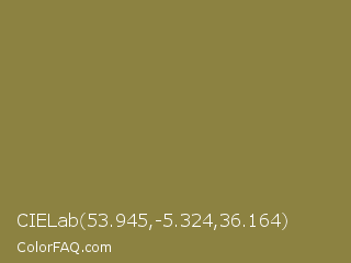 CIELab 53.945,-5.324,36.164 Color is a normal yellow color and the nearest color is Old Moss Green #867e36. Hex code #8c8241 and RGB value is rgb(140,130,65). In RGB color space, this color is composed of 55% red, 51% green, 25% blue, In CMYK color space, this color is composed of 0% cyan, 7% magenta, 54% yellow , 45% black , In HSL color space, this color has a hue angle of 52° , 37% saturation and 40% lightness.